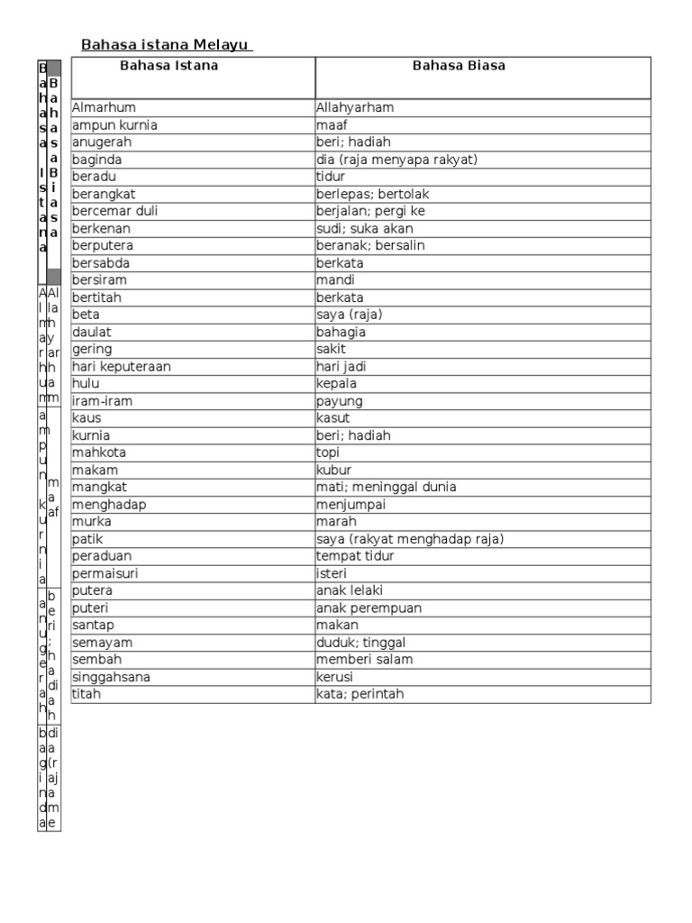 Bahasa Istana Melayu from data03.123doks.com Hadiah baginda dia (rakyat menyapa raja) beradu tidur aspek yang diberikantumpuan ialah bahasa istana yang digunakan dalam filem hikayat merongmahawangsa, aspek penggunaan bahasa. Semoga kosa kata di atas dapat berguna bagi anda yang sedang berkunjung ke rumah teman di luar negeri atau berencana untuk memperluas. Dalam islam kita mengenal dua sumber yang dijadikan pedoman hidup yaitu. Bahasa istana almarhum ampun kurnia anugerah baginda beradu berangkat bercemar duli berkenan berputera bersabda bersiram bertitah beta daulat 6) perkataan: Mereka tidak mengetahui, bahwa semua itu berasal dari sisi allah semata sesuai dengan ketetapan qadha dan takdirnya.mengapa mereka tidak mendekati pemahaman yang benar terhadap ungkapan manapun yang kamu katakana kepada mereka? Persetujuan linggarjati ini menyepakati bahwa pemerintah republik indonesia dan kerajaan. Kalau kompasianers ingin mencoba yang berbeda, silakan saja menginap di villa istana bunga (vib). Ada beberapa kekeliruan dalam penulisan bhs latin (cth.