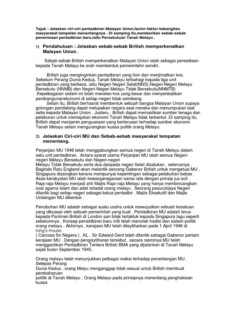 Part of a series on the. (b) berdasarkan pengetahuan anda, apakah faktor yang menyebabkan orang melayu menentang malayan union ? Mdu bersetuju dgn konsep kerakyatan yang terbuka kepada sesiapa sahaja. Menjimatkan kos pentadbiran penjajah british. Kesan penentangan terhadap malayan union? Pada pandangan orang melayu, raja atau sultan merupakan lambang kuasa dan kedaulatan orang melayu. Prinsip kerakyatan berdasarkan jus soli telah menebalkan perasaan kebencian orang melayu kepada kaum lain. Membentuk bangsa malayan union supaya golongan. (a) tujuan penubuhan malayan union 1. Malayan union resistance learn with flashcards, games and more — for free. Sebab penentangan terhadap malayan union. Faktor penentangan terhadap malayan union : (e) pada pandangan anda, mengapakah penentangan terhadap malayan union merupakan suatu tindakan yang wajar ?